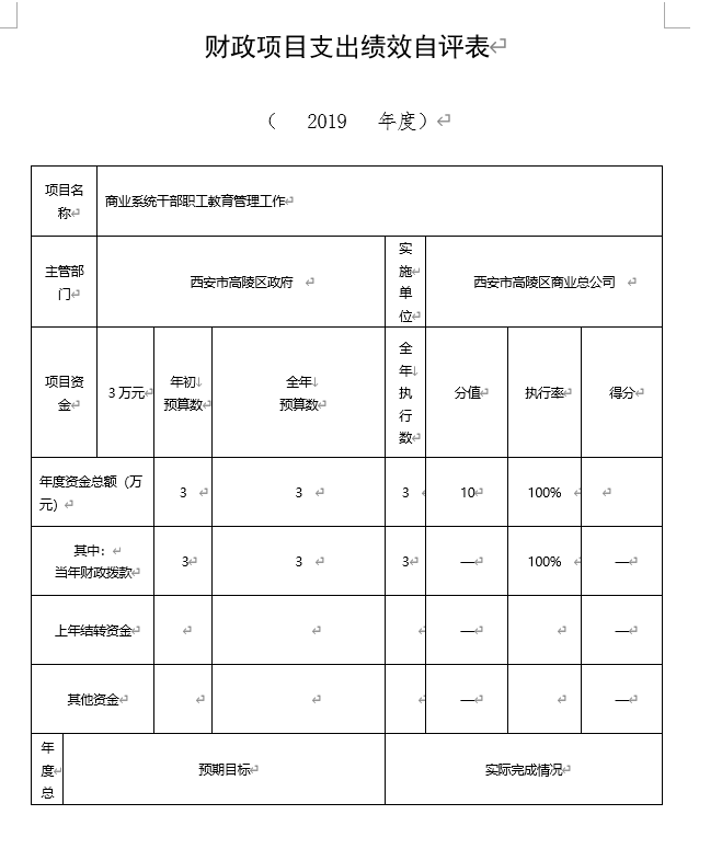 1、商業系統干部職工教育管理工作項目績效自評綜述:根據年初設定的績效目標,項目自評得分85分。項目全年預算數3萬元,執行數3萬元,完成預算的100%。