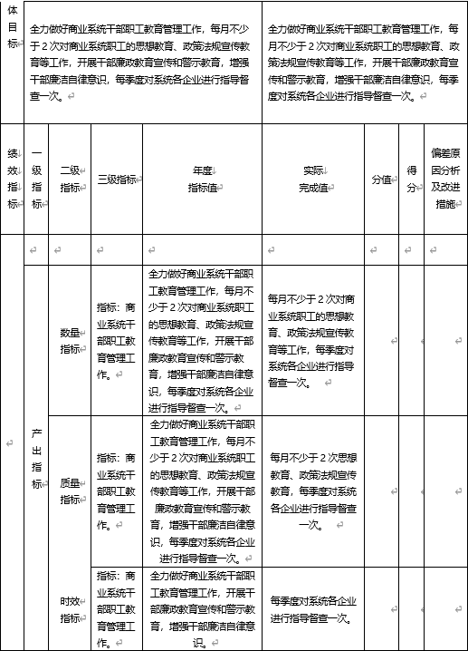 全力做好商業系統干部職工教育管理工作,開展干部廉政教育宣傳和警示教育,增強干部廉潔自律意識,每月不少于2次思想教育、政策法規宣傳教育,每季度對系統各企業干部職工教育管理工作指導督促一次。