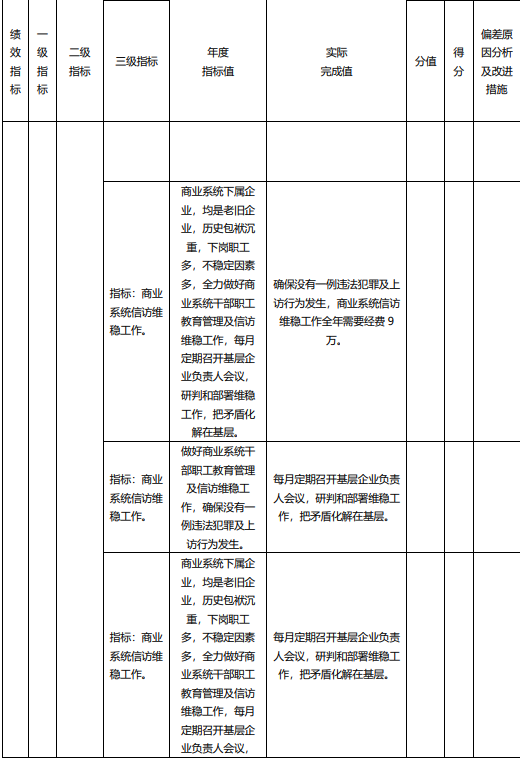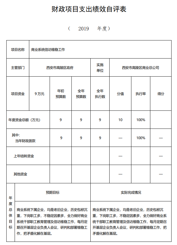 2、商業系統信訪維穩工作項目績效自評綜述:根據年初設定的績效目標,項目自評得分84分。項目全年預算數9萬元,執行數9萬元,完成預算的100%。