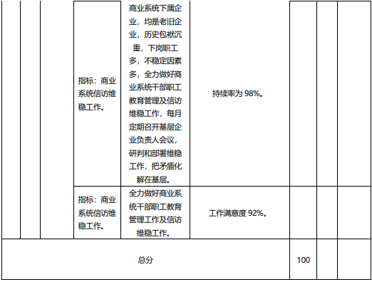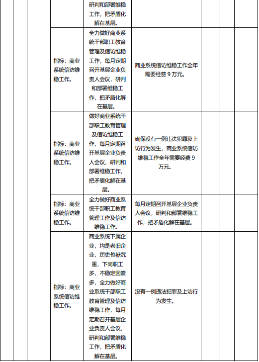 主要產出和效果:商業系統下屬各企業均是老舊企業,歷史包袱沉重,下崗職工多,不穩定因素多,全力做好商業系統干部職工教育管理及信訪維穩工作,每月定期召開基層企業負責人會議,研判和部署維穩工作,把矛盾化解在基層。