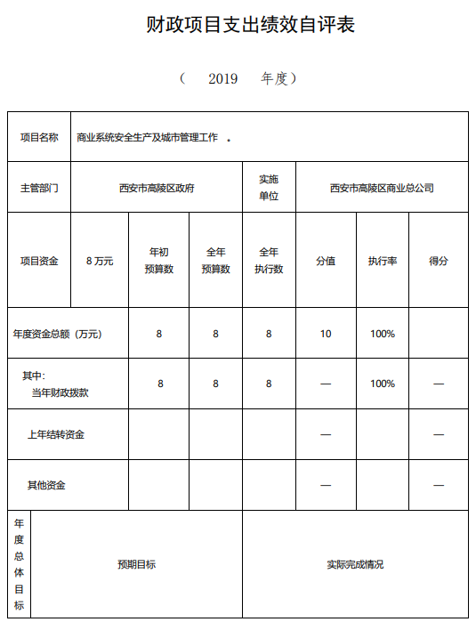 3、商業系統安全生產及城市環境衛生管理工作項目績效自評綜述:根據年初設定的績效目標,項目自評得分86分。項目全年預算數8萬元,執行數8萬元,完成預算的100%。