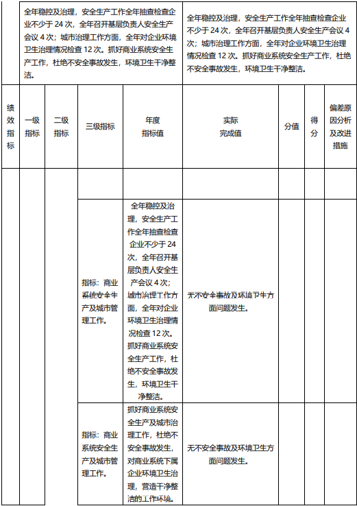 主要產出和效果:商業系統安全生產及城市環境衛生管理工作全年穩控及治理,安全生產工作全年抽查企業不少于24次,全年召開基層負責人安全生產會議4次。城市治理工作方面,全年對企業環境衛生治理情況檢查12次。抓好商業系統安全生產工作,杜絕不安全事故發生,環境衛生干凈整潔。
