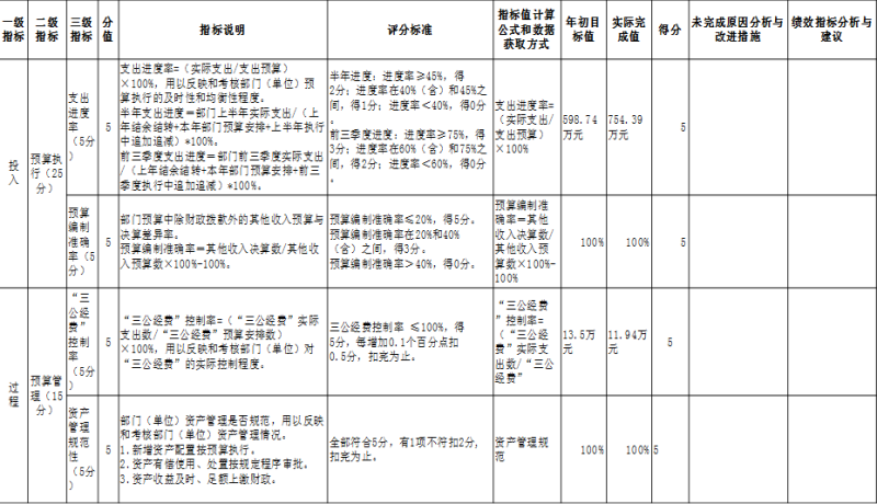 | 績 效 指 標 | 一級指標 | 二級指標 | 三級指標 | 年度 指標值 | 實際 完成值 | 分值 | 得分 | 偏差原因分析及改進措施 |