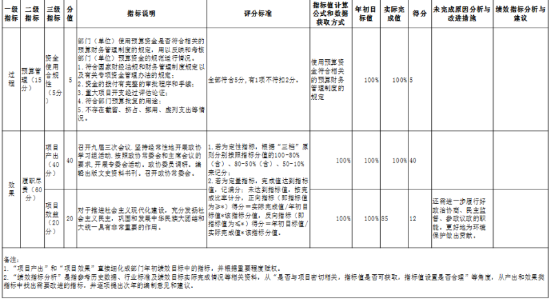 | 效益指標 | 經濟效益指標 | 履行政治協商、民主監督、參政議政的職能,促進區域經濟發展。 | 達到預期效果 | 達到預期效果 | 10 | 5 | ||