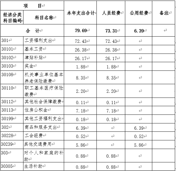 2019年度一般公共預算財政撥款基本支出79.69萬元,包括:人員經(jīng)費支出73.31萬元和公用經(jīng)費支出6.39萬元。