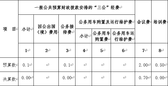 注:本表反映部門本年度一般公共預算財政撥款“三公”經(jīng)費、會議費、培訓費的預算數(shù)和實際支出。預算數(shù)為調(diào)整預算數(shù)。本表金額轉(zhuǎn)換為萬元時,因四舍五入可能存在尾差。