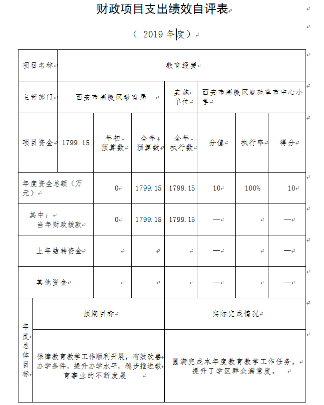小學(xué)教育項(xiàng)目績(jī)效自評(píng)綜述:根據(jù)年初設(shè)定的績(jī)效目標(biāo),項(xiàng)目自評(píng)得分100分。項(xiàng)目全年預(yù)算數(shù)(調(diào)整預(yù)算數(shù))1,799.15萬(wàn)元,執(zhí)行數(shù) 1,799.15萬(wàn)元,完成預(yù)算的100%。