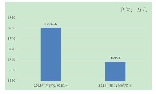 2019 年度收入合計 3760.56 萬元,其中:財政撥款收入 3674.17萬元,占 97.7%,事業收入:72.4萬元,占1.93%,其他收入:13.99萬元,占:0.37%,政府性基金預算財政撥款0萬元。