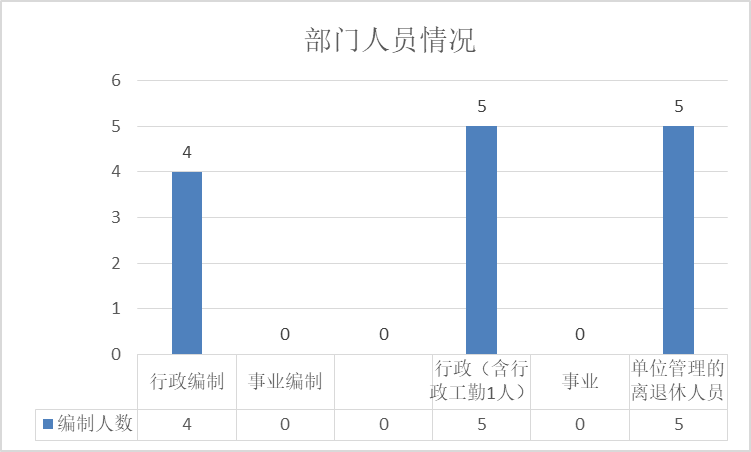 截止2019年底,本部門人員編制4人,其中行政編制4人、事業編制0人;實有人員5人,其中行政5人(含行政工勤人員1人)、事業0人。單位管理的離退休人員5人。