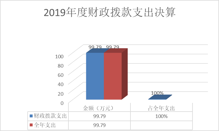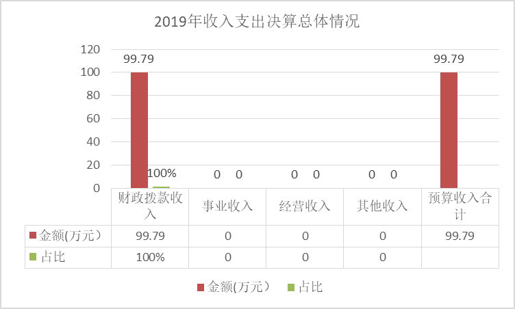 2019年度收入合計99.79萬元,其中:財政撥款收入99.79萬元,占100%;事業收入0萬元,占0%;經營收入0萬元,占0%;其他收入0萬元,占0%。