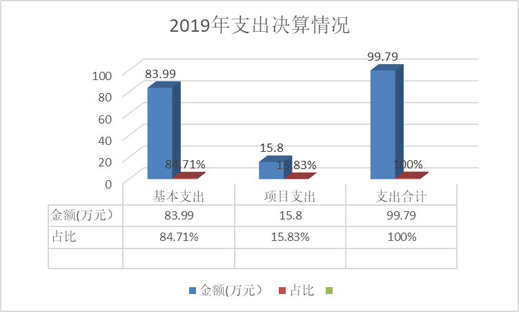 2019年度支出合計99.79萬元,其中:基本支出83.99萬元,占84.17%;項目支出15.80萬元,占15.83%。