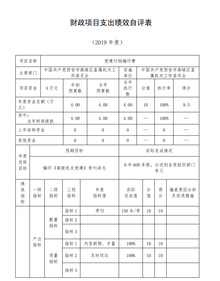 主要產出和效果:編印《高陵機關黨建》季刊雜志,每期150本左右,每本預算在40元~50元之間。
