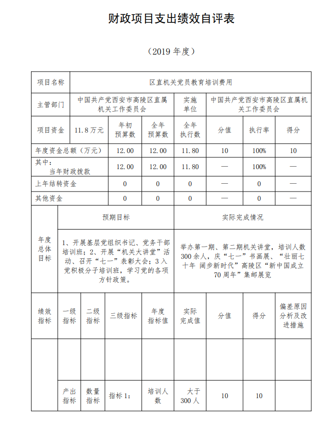 2、區直機關黨員教育培訓費用項目績效自評綜述:根據年初設定的績效目標,項目自評得分96分。項目全年預算數12萬元,執行數 11.8萬元,完成預算的98.33%。