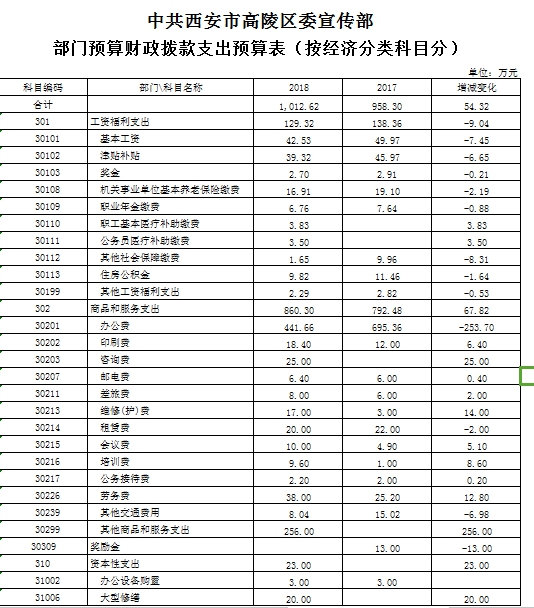 2017年度一般公共預算撥款收入958.30萬元,其中基本支出166.30萬元,項目支出792.00萬元;2018年度一般公共預算撥款收入1012.62萬元,其中基本支出142.62萬元,項目支出870萬元。同比增加54.32萬元,由于新增加了人員以及新成立了科室,所以經(jīng)費增加。