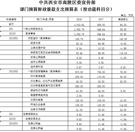 2018年收入預算1012.62萬元,2017年收入預算958.30萬元, 2018年收入預算較上年增長了54.32萬元,增幅5.67%。2018年支出預算1012.62萬元,2017年支出預算958.30萬元,2018年支出預算較上年增長了54.32萬元,增幅5.67%。原因是人員經(jīng)費增長,基本支出經(jīng)費增長。