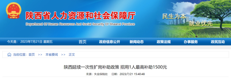 近日,記者獲悉,陜西省決定延續實施一次性擴崗補助政策,企業每招用1人,按1500元的標準給予一次性擴崗補助這一政策執行起止時間為2023年6月25日至2023年12月31日。