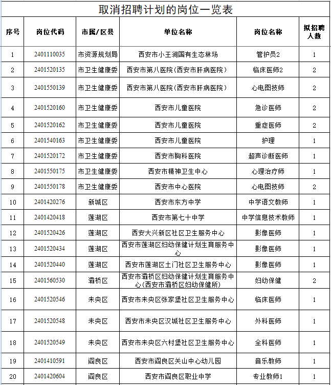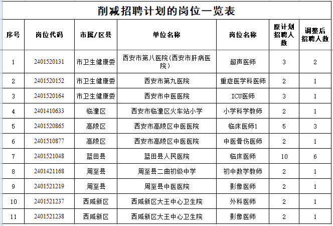 2024年西安市事業(yè)單位公開招聘(募)工作人員網(wǎng)上繳費與報名確認(rèn)已結(jié)束,根據(jù)《中共西安市委組織部西安市人力資源和社會保障局關(guān)于2024年西安市事業(yè)單位公開招聘(募)工作人員的公告》中開考比例的規(guī)定,現(xiàn)就削減和取消部分崗位招聘計劃情況公告如下: