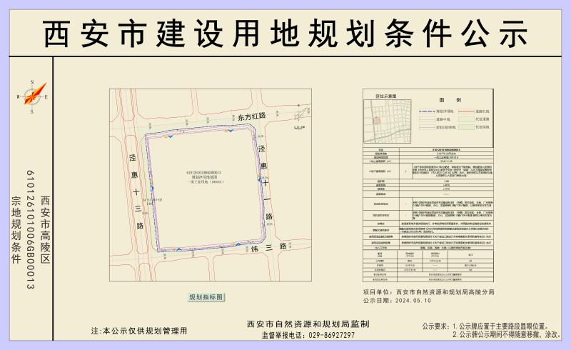 610126101006GB00013地塊用地性質為一類工業用地(100101);凈用地面積約325.155畝,容積率1.08(該指標為控制下限),建筑系數≥40%,綠地率≤15%。配套設施:公共廁所建筑面積60㎡,環網柜用地面積126㎡,垃圾收集點占地120㎡。