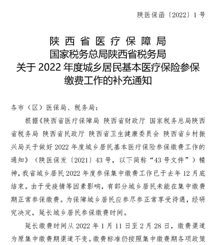 昨日,陜西省醫(yī)保局、國家稅務(wù)總局、陜西省稅務(wù)局印發(fā)了《關(guān)于2022年度城鄉(xiāng)居民基本醫(yī)療保險(xiǎn)參保繳費(fèi)工作的補(bǔ)充通知》,決定為錯(cuò)過繳費(fèi)期的參保群眾延長繳費(fèi)期限開通補(bǔ)繳通道。