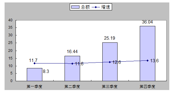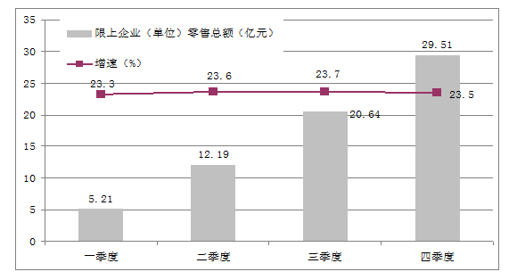 全年社會消費品零售總額36.04億元,比上年增長13.6%,其中,限額以上企業(單位)消費品零售額29.51億元,增長23.5%。按消費形態統計,批發業實現銷售額83.49億元,同比增長8.8%;零售額實現銷售額55.06億元,同比增長16.9%;餐飲業實現營業額6.69億元,增長15.5%;住宿業實現營業額0.72億元,同比增長6.7%。