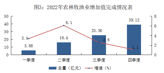 (二)農業增加值:2022年,全區農林牧漁業增加值實現39.12億元,可比增長1.1%,增速較前三個季度分別回落2.3、5.0、1.5個百分點;農林牧漁業總產值63.86億元,同比增長1.3%,增速較上年同期回落5.4個百分點。