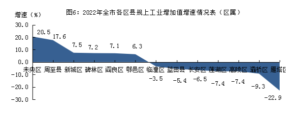 與產業結構多元區各區縣對比看(在地):灞橋增速排十三區縣第3位,增長5.0%,高我區3.4個百分點;閻良區增速排十三區縣第1位,增長26.2%,高我區24.6個百分點;臨潼區增速排十三區縣第10位,增長-8.4%,低我區10個百分點;長安區增速排十三區縣第5位,增長-2.1%,低我區3.7個百分點;鄠邑區增速排十三區縣第2位,增長6.9%,高我區5.3個百分點。