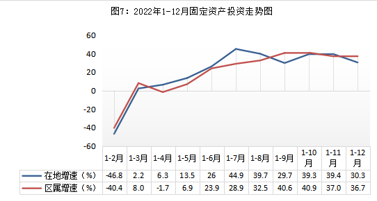 (四)固定資產投資:1—12月,在地固定資產投資同比增長36.7%,增速較上年同期提高95.6個百分點,排十三區縣第4位,排位較上年同期前移9位。區屬固定資產投資同比增長30.3%,增速較上年同期提高97.7個百分點,排十三區縣第2位,排位較上年同期前移11位。全市固定資產投資同比增長10.5%,高于上年同期22.1個百分點。