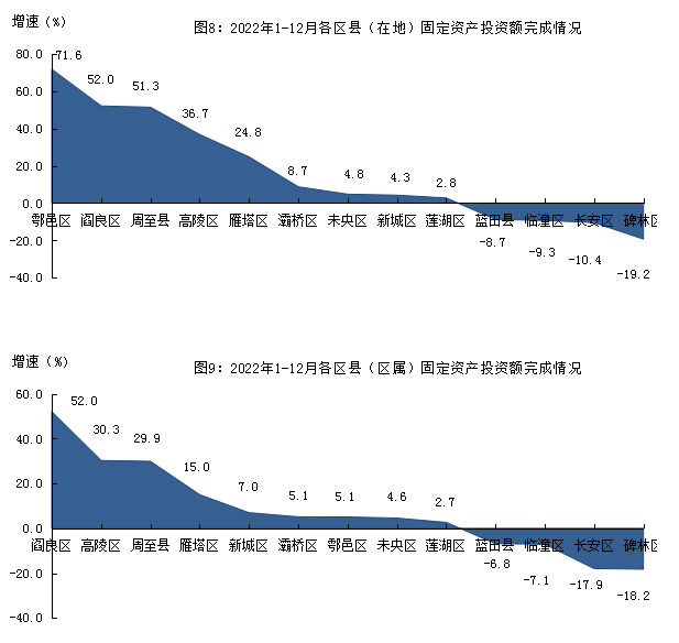 與產業結構多元區各區縣對比看:灞橋增速排十三區縣第10位,增長-5.2%,高我區1.7個百分點;閻良區增速排十三區縣第6位,增長7.1%,高我區14個百分點;臨潼區增速排十三區縣第9位,增長-3.5%,高我區3.4個百分點;長安區增速排十三區縣第3位,增長16.2%,高我區23.1個百分點;鄠邑區增速排十三區縣第1位,增長80.3%,高我區87.2個百分點。
