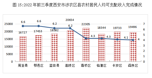 農村常住居民人均可支配收入與產業結構多元區各縣對比看:灞橋區增速排十三區縣第6位,增長4.3%,低我區1.9個百分點;閻良區增速排十三區縣第8位,增長4.0%,低我區2.2個百分點;臨潼區增速排十三區縣第6位,增長4.3%,低我區1.9個百分點;長安區增速排十三區縣第7位,增長4.1%,低我區2.1個百分點;鄠邑區增速排十三區縣第1位,增長6.6%,高我區0.4個百分點。