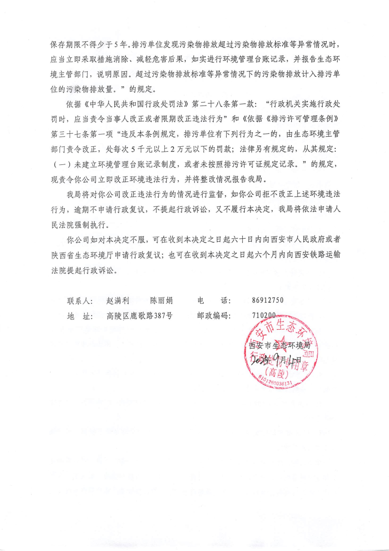 西安市生態環境局責令改正違法行為決定書陜A高陵環違改〔2023〕A-10號