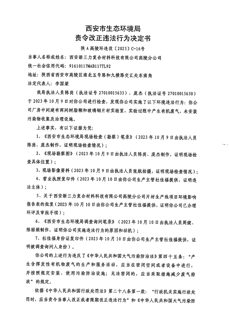西安市生態環境局高陵分局責令改正違法行為決定書〔2023〕C-16號