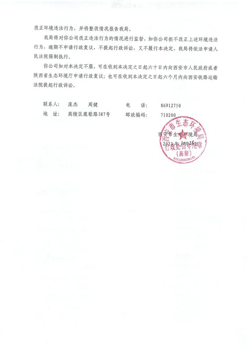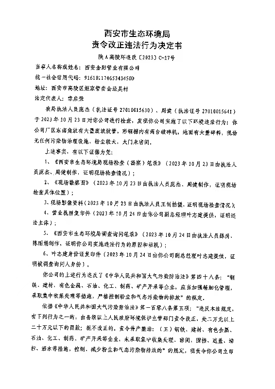西安市生態環境局高陵分局責令改正違法行為決定書〔2023〕C-17號