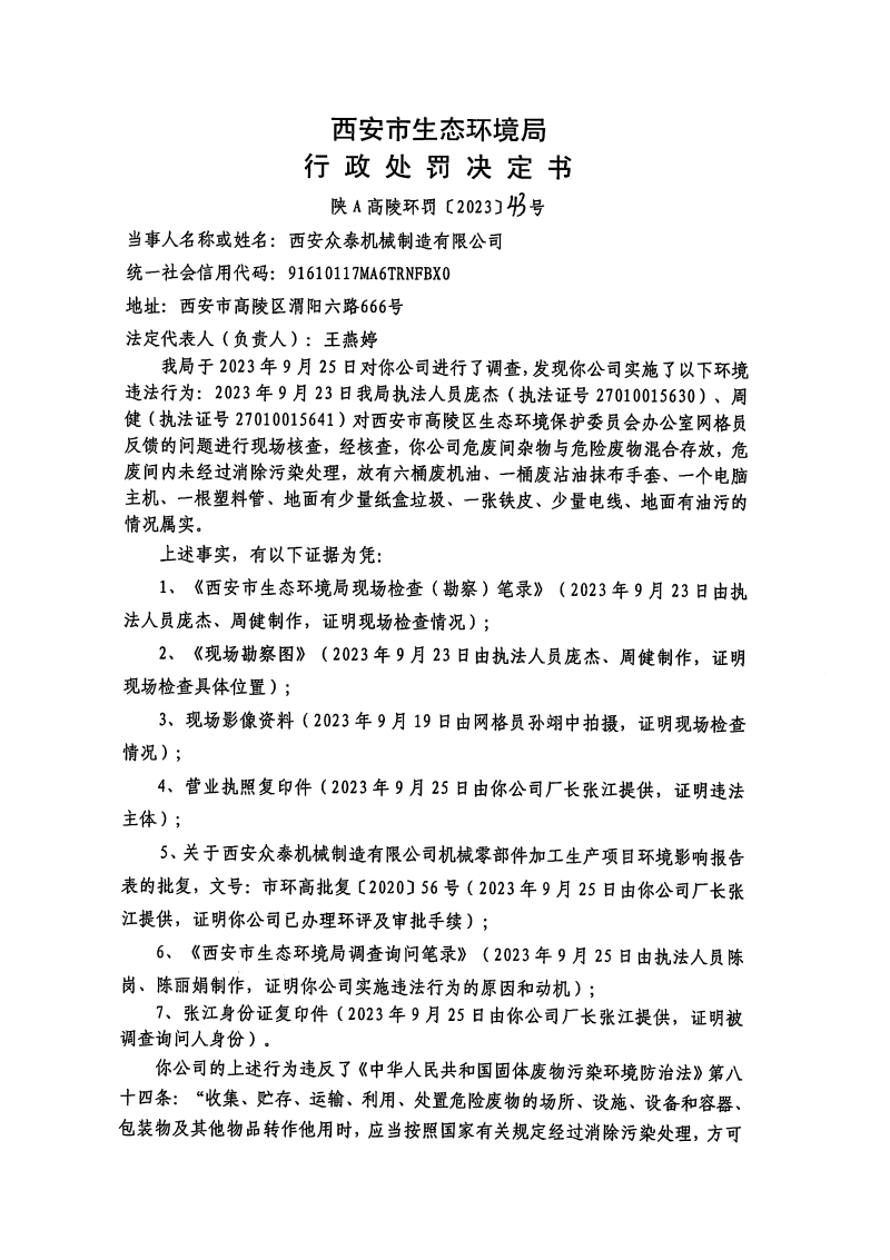 西安市生態(tài)環(huán)境局行政處罰決定書陜A高陵環(huán)罰〔2023〕43號
