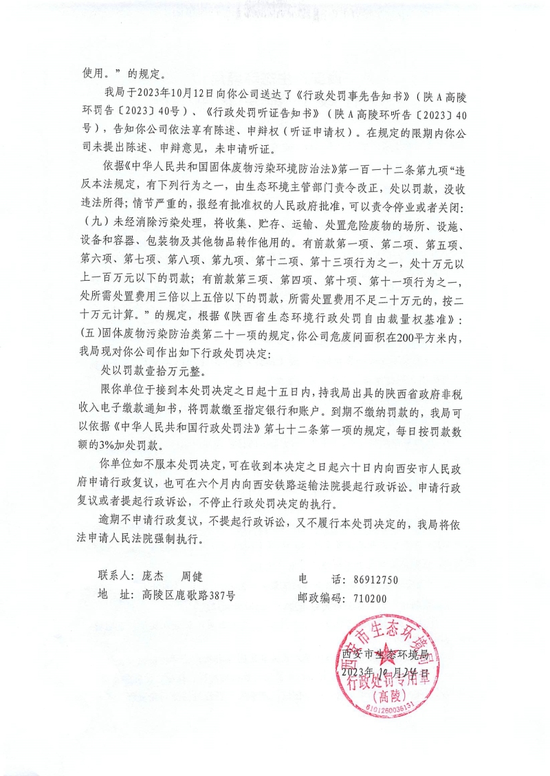 西安市生態(tài)環(huán)境局行政處罰決定書陜A高陵環(huán)罰〔2023〕43號 |