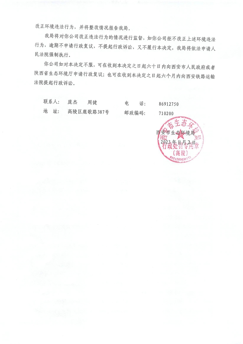 西安市生態環境局高陵分局責令改正違法行為決定書〔2023〕C-19號