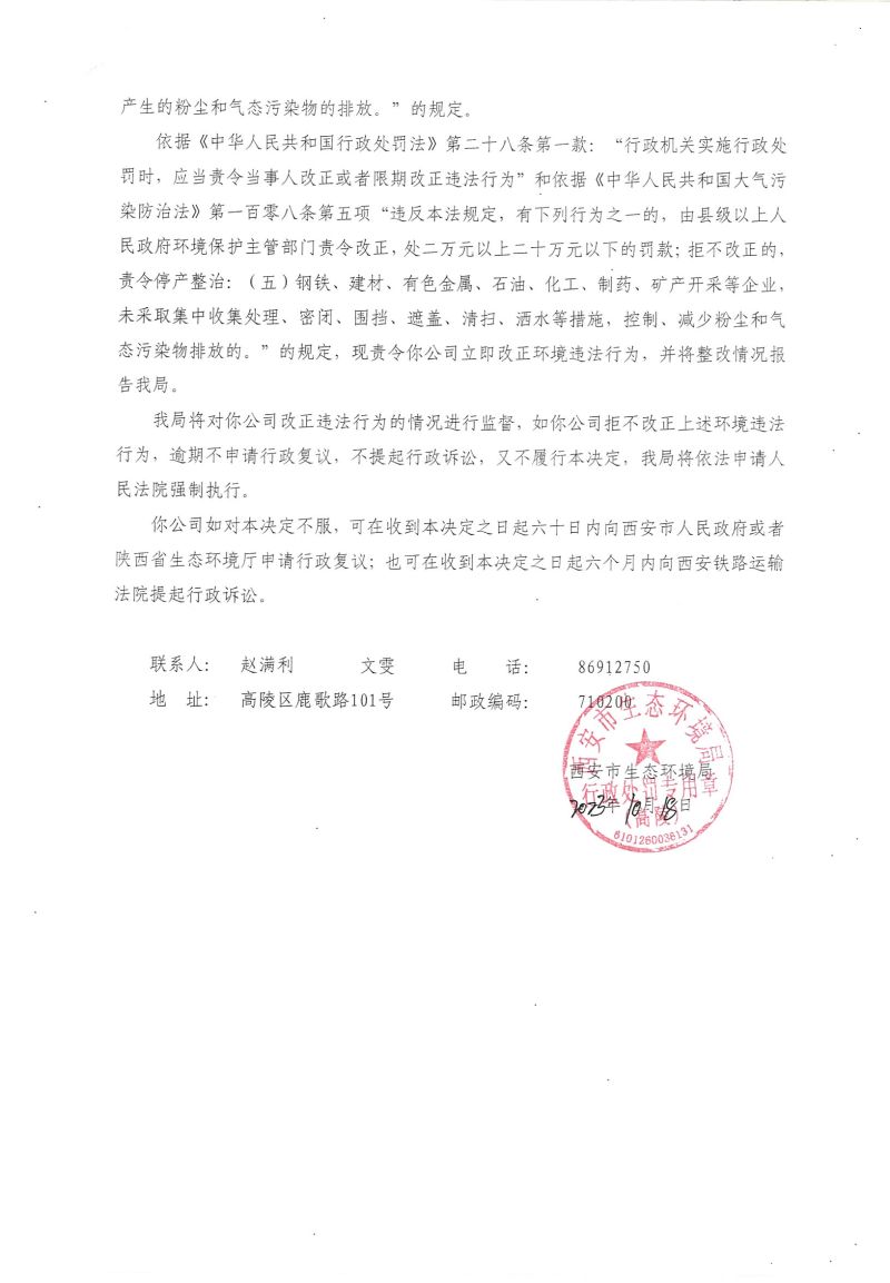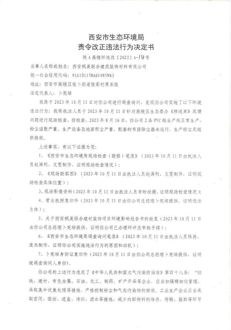 西安市生態環境局高陵分局責令改正違法行為決定書〔2023〕A-14號