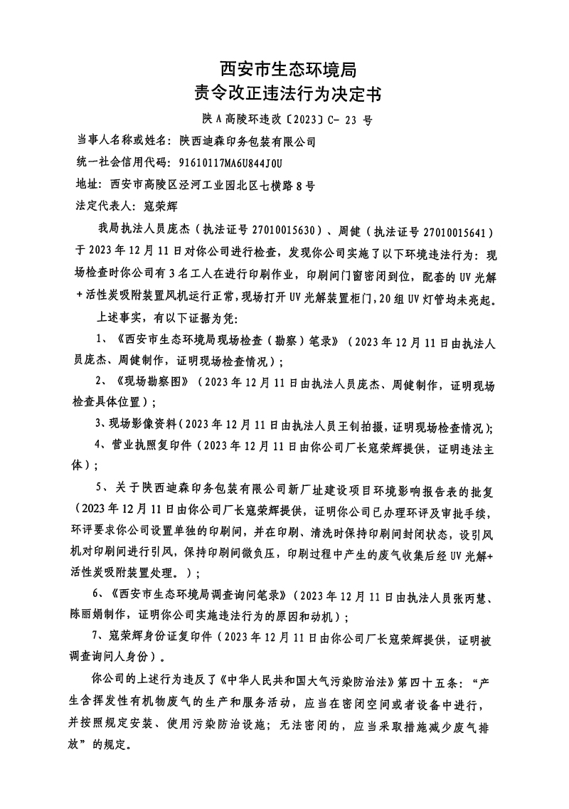 西安市生態(tài)環(huán)境局高陵分局責令改正違法行為決定書〔2023〕C-23號