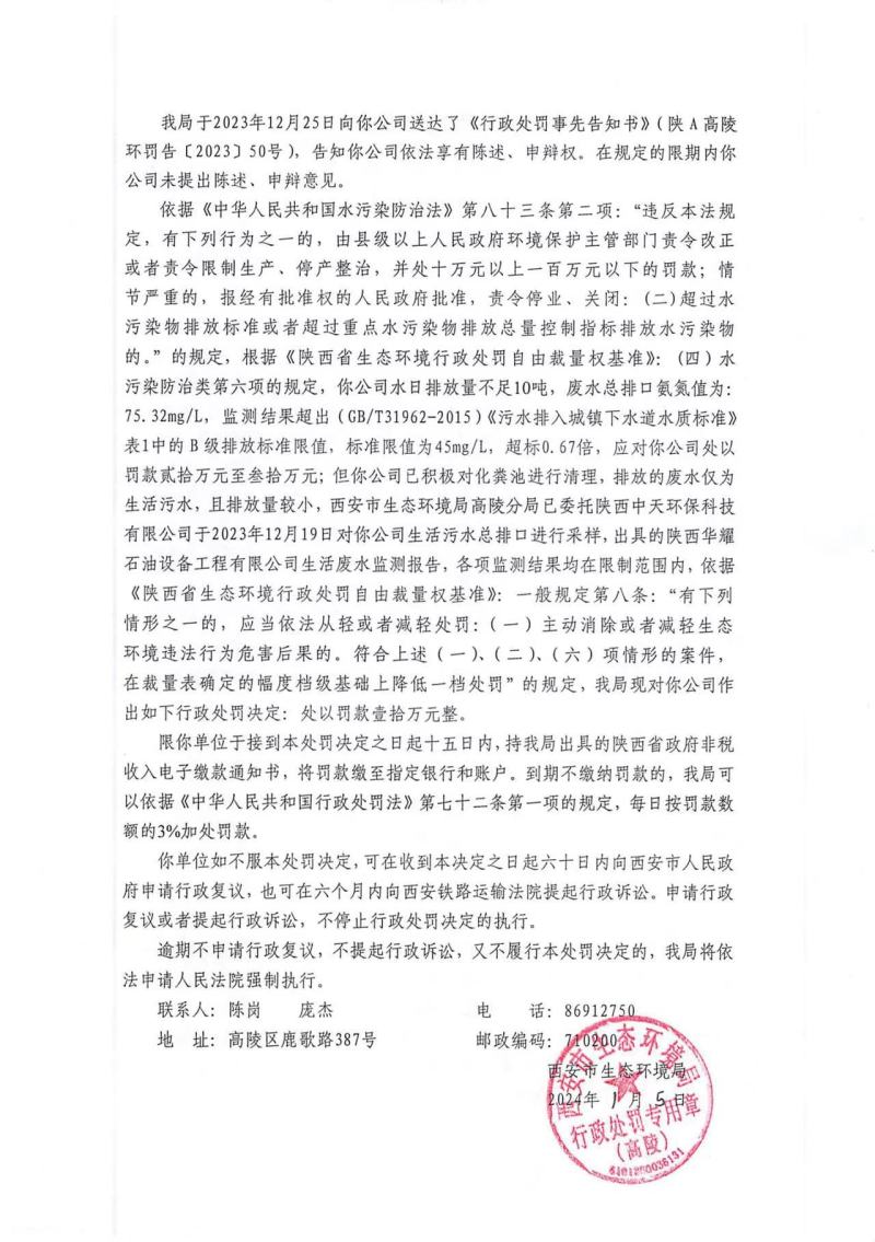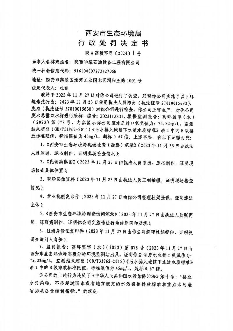 西安市生態(tài)環(huán)境局行政處罰決定書陜A高陵環(huán)罰〔2024〕1號(hào)