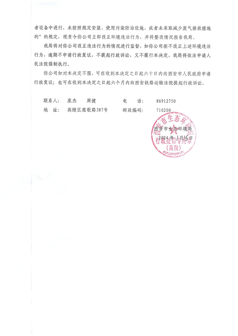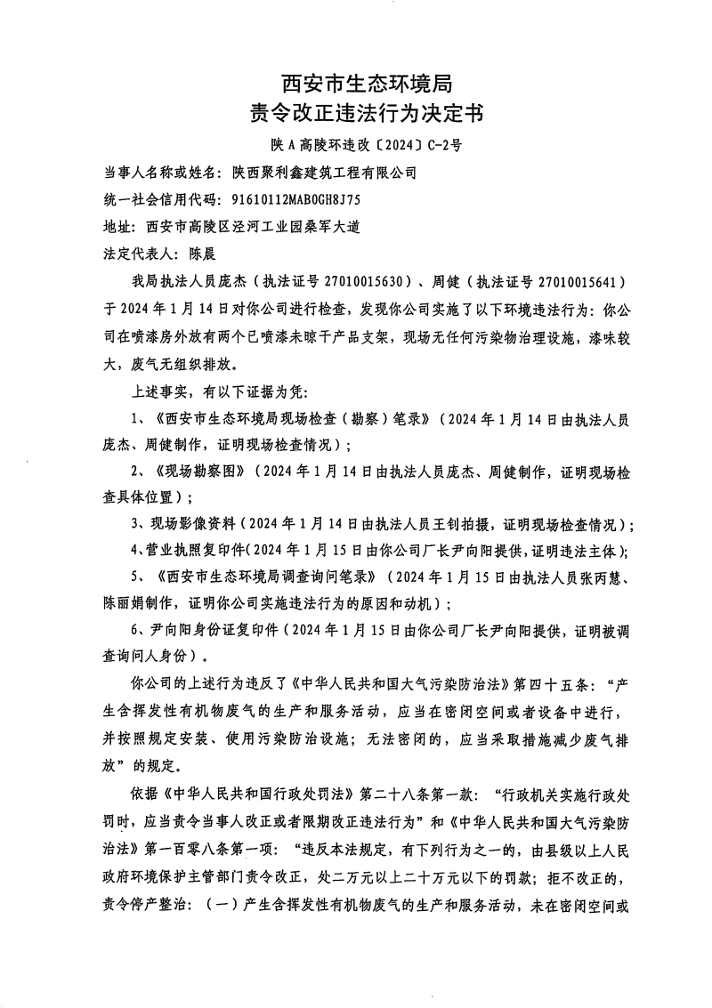 西安市生態環境局高陵分局責令改正違法行為決定書陜A高陵環違改[2024]C-2號
