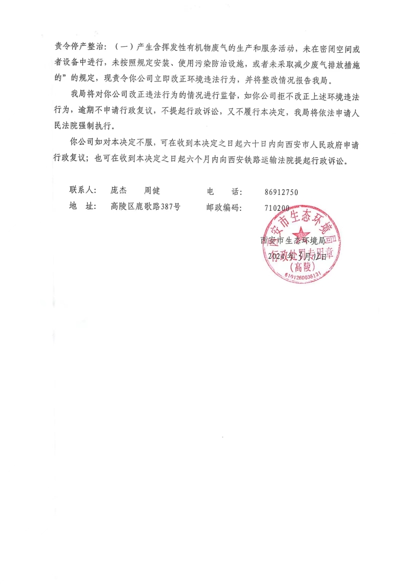 西安市生態環境局高陵分局責令改正違法行為決定書陜A高陵環違改〔2024〕C-3號