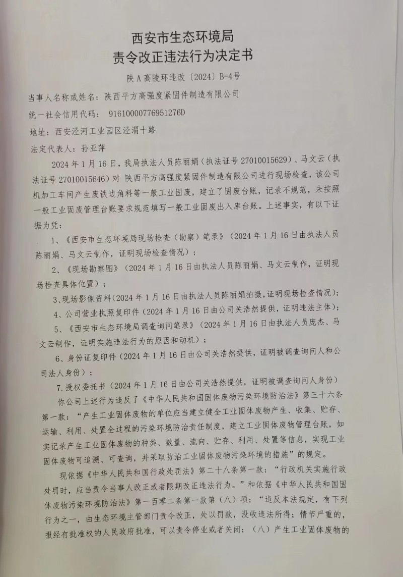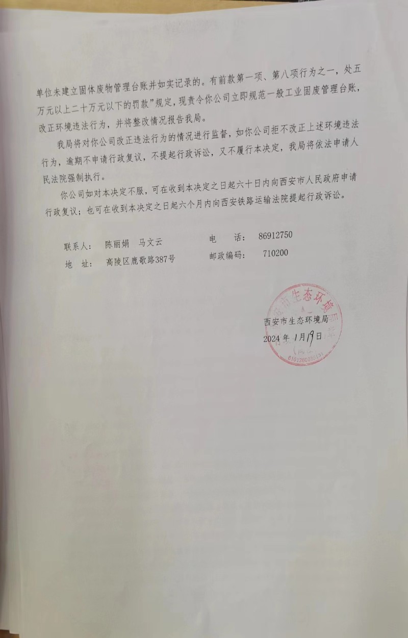 西安市生態環境局高陵分局責令改正違法行為決定書陜A高陵環違改〔2024〕B-4號