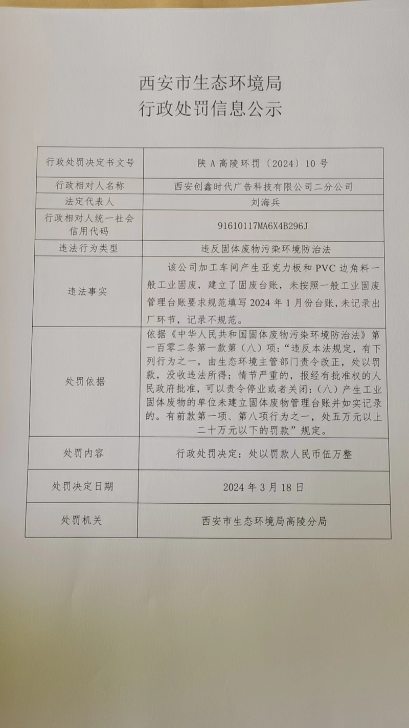 西安市生態環境局行政處罰信息公示陜A高陵環罰〔2024〕10號