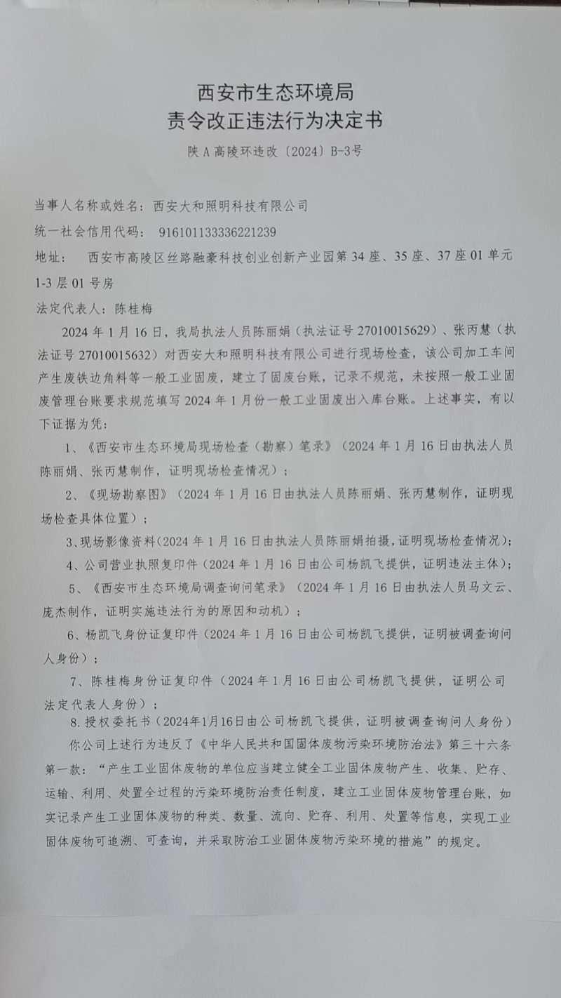 西安市生態環境局高陵分局責令改正違法行為決定書陜A高陵環違改〔2024〕B-3號