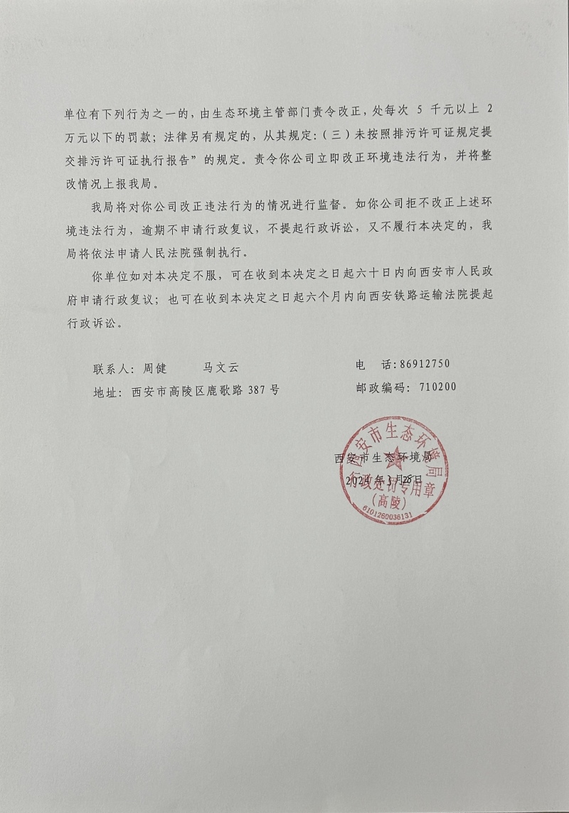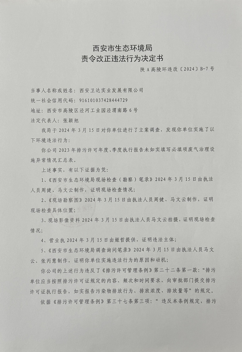西安市生態環境局高陵分局責令改正違法行為決定書陜A高陵環違改﹝2024﹞B-7號