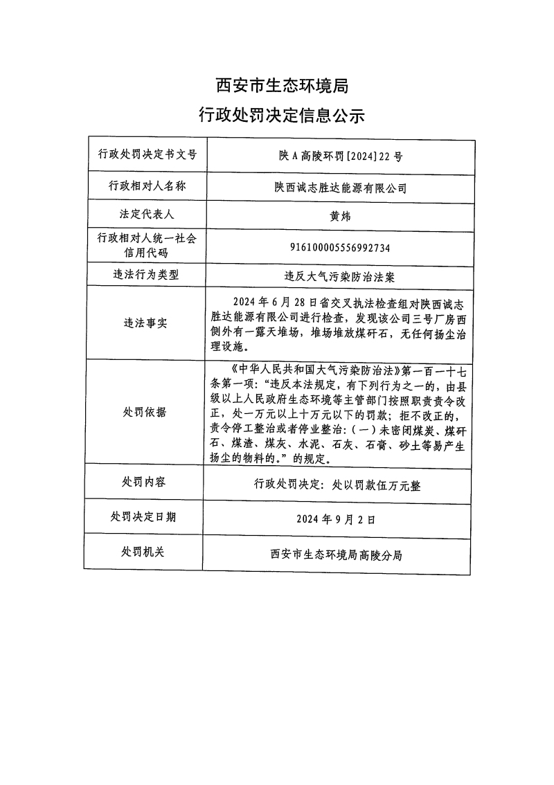 西安市生態環境局行政處罰決定信息公示陜A高陵環罰【2024】22號