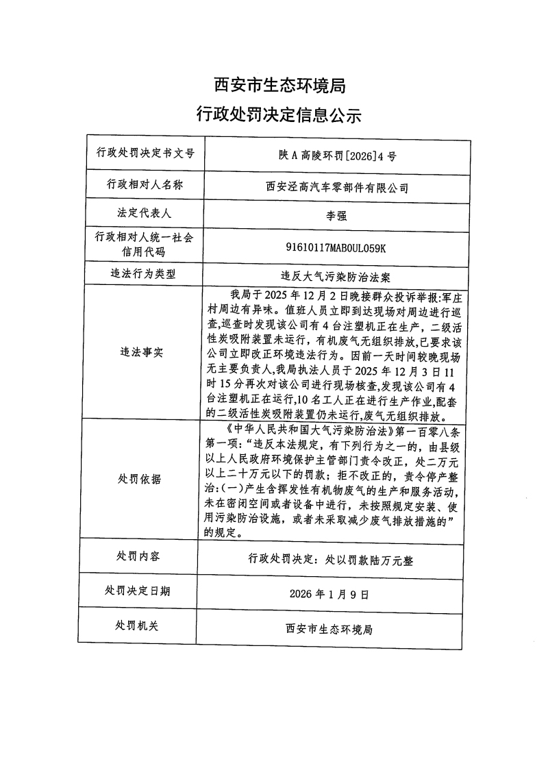 西安市生態(tài)環(huán)境局行政處罰決定信息公示陜A高陵環(huán)罰〔2026〕4號