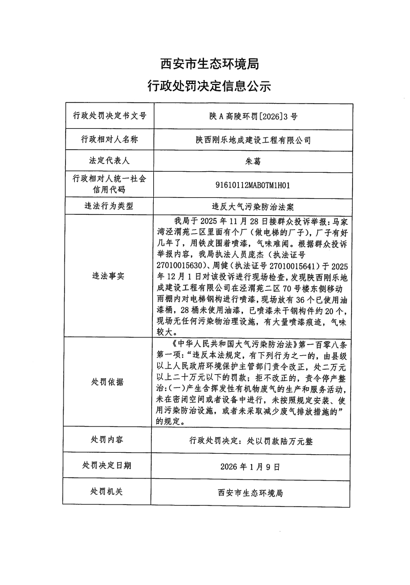 西安市生態環境局行政處罰決定信息公示陜A高陵環罰〔2026〕3號