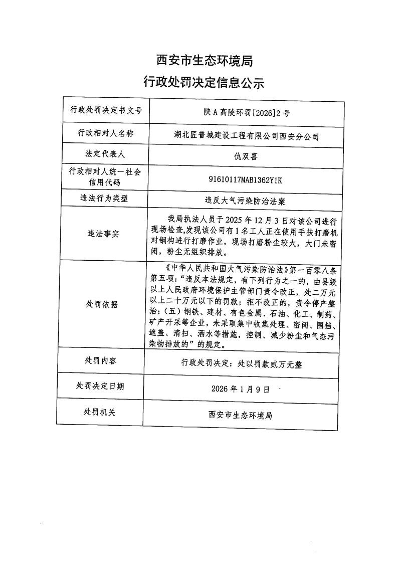 西安市生態(tài)環(huán)境局行政處罰決定信息公示陜A高陵環(huán)罰〔2026〕2號(hào)