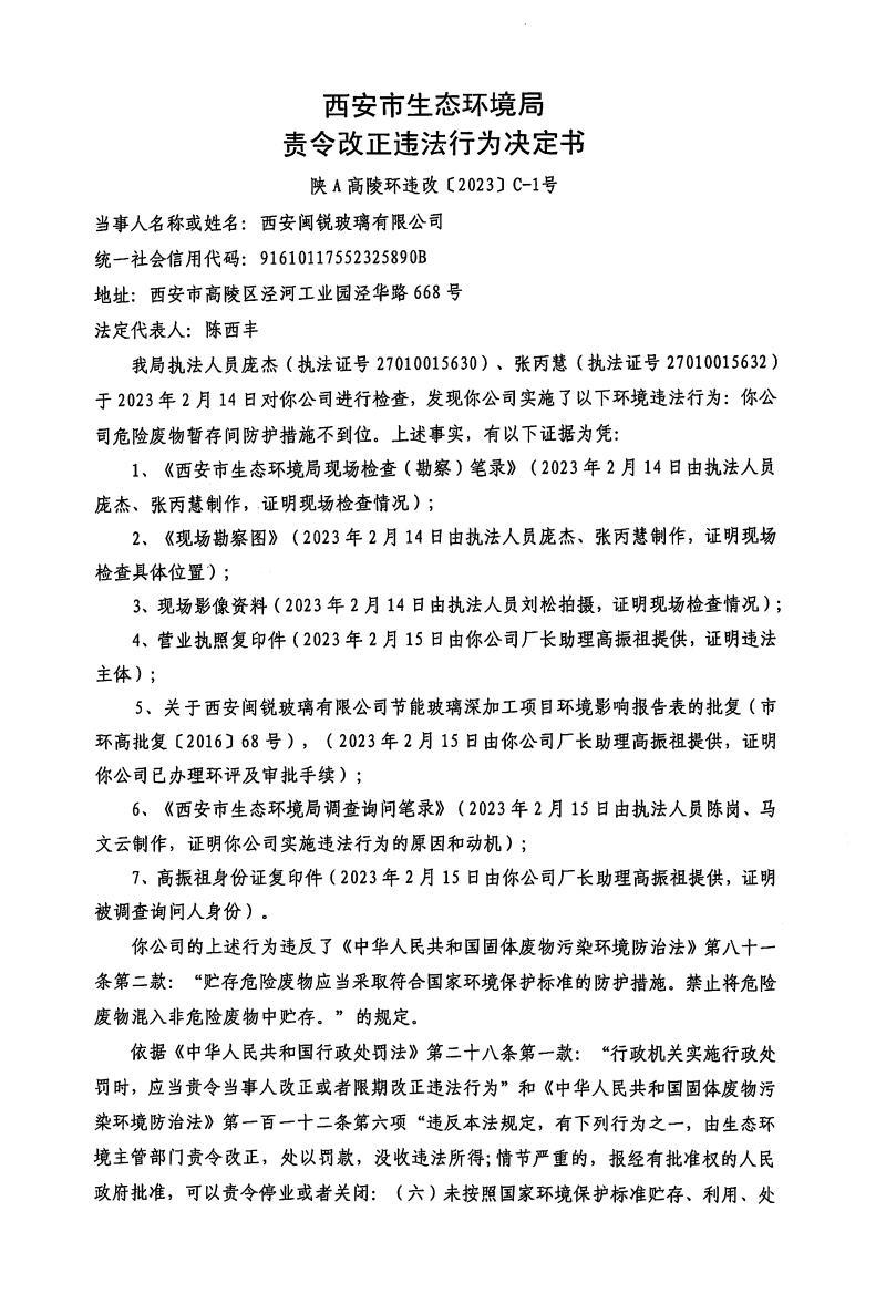 西安市生態(tài)環(huán)境局責令改正違法行為決定書陜A高陵環(huán)違改〔2023〕C-1號 |