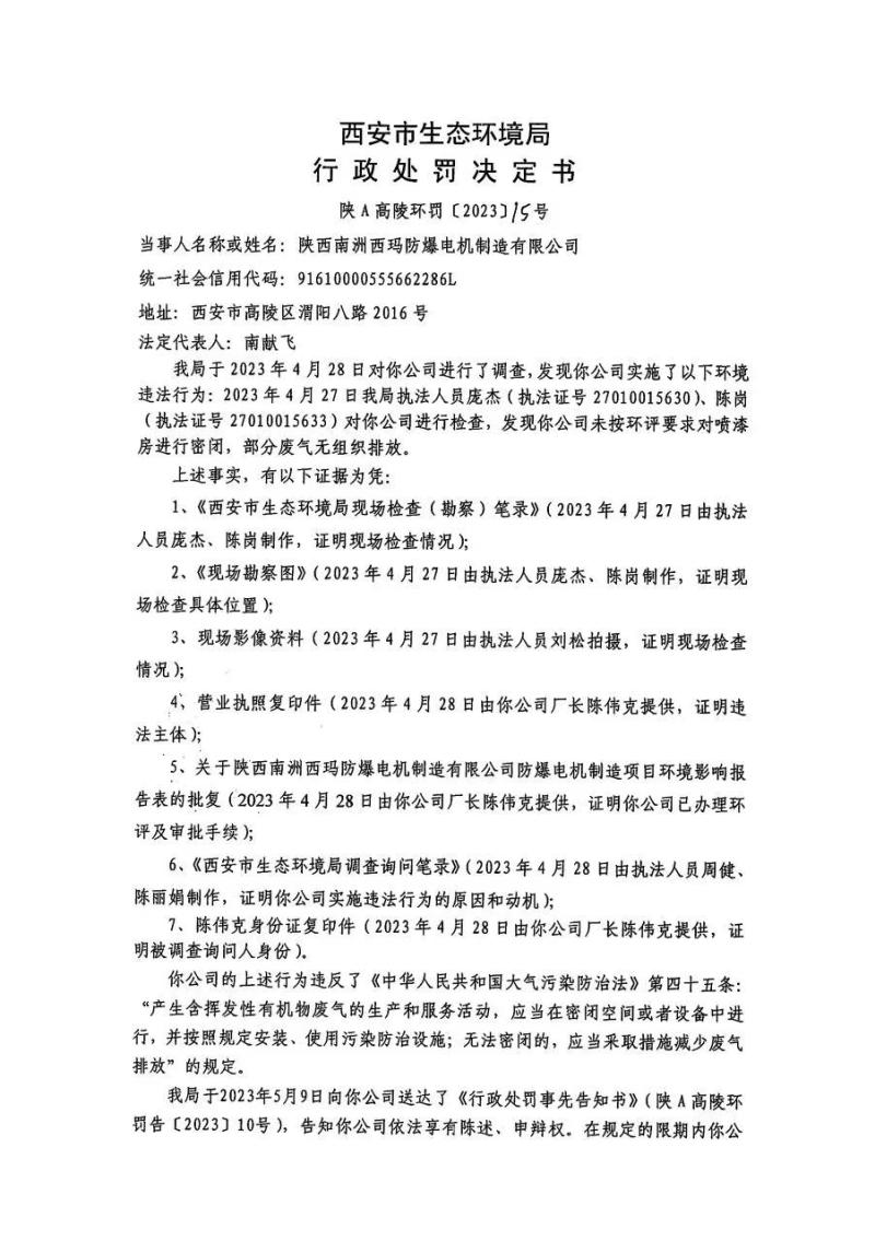 西安市生態環境局行政處罰決定書陜A高陵環罰〔2023〕15號